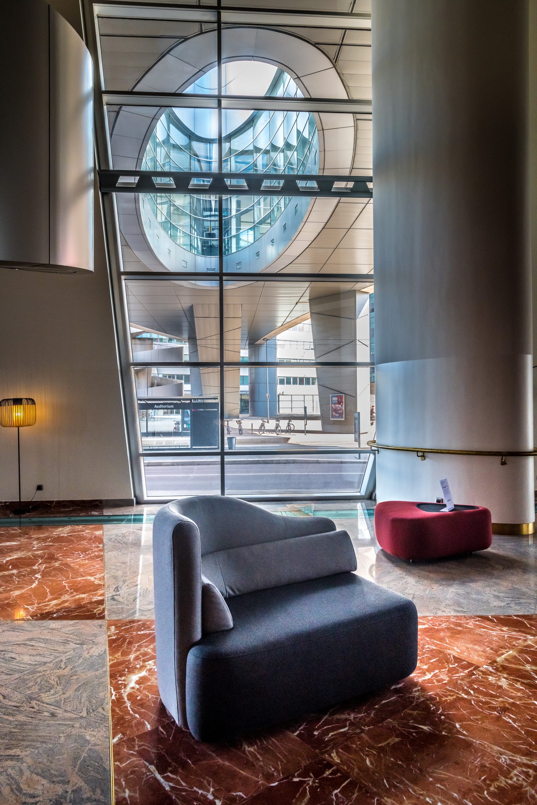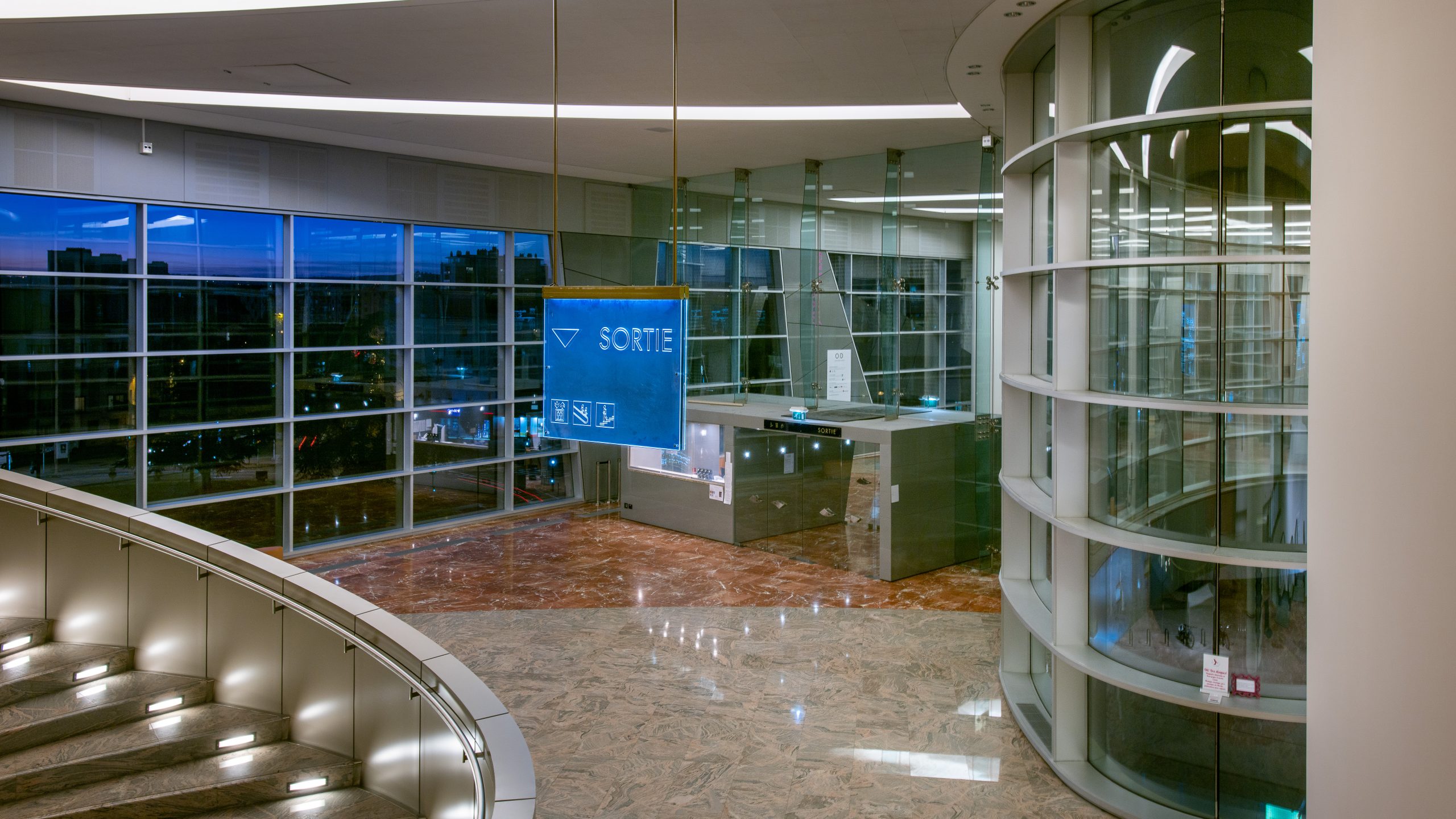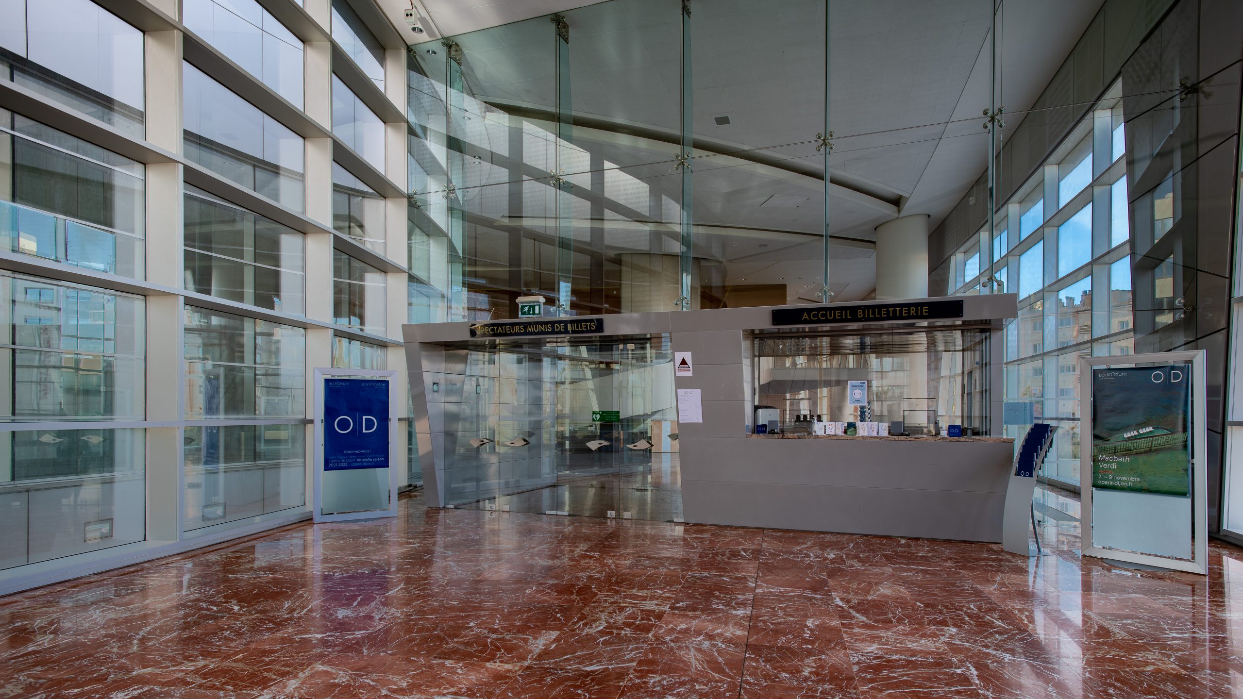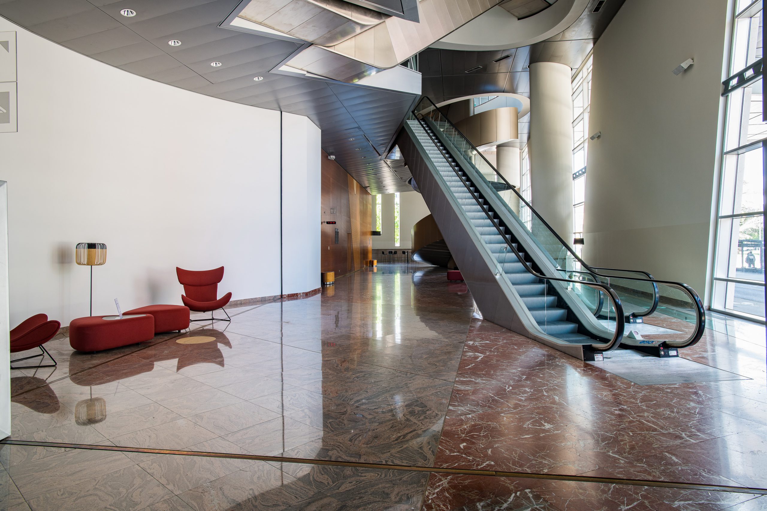 Les spectateurs entrent dans le bâtiment par de grands escalators et arrivent dans un immense espace vitré, avec une large vue sur le boulevard Clémenceau, à plus de 12 mètres de haut.
