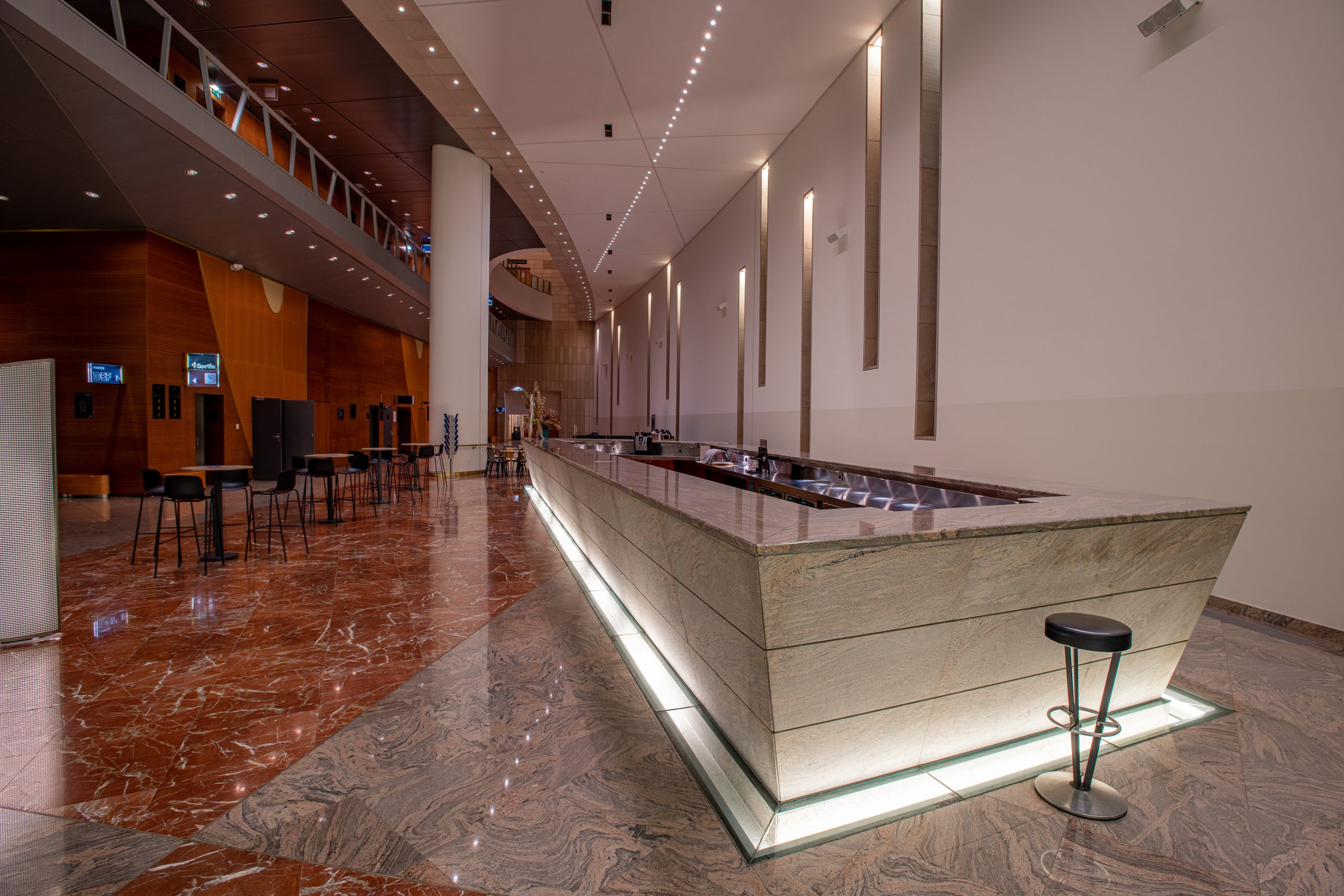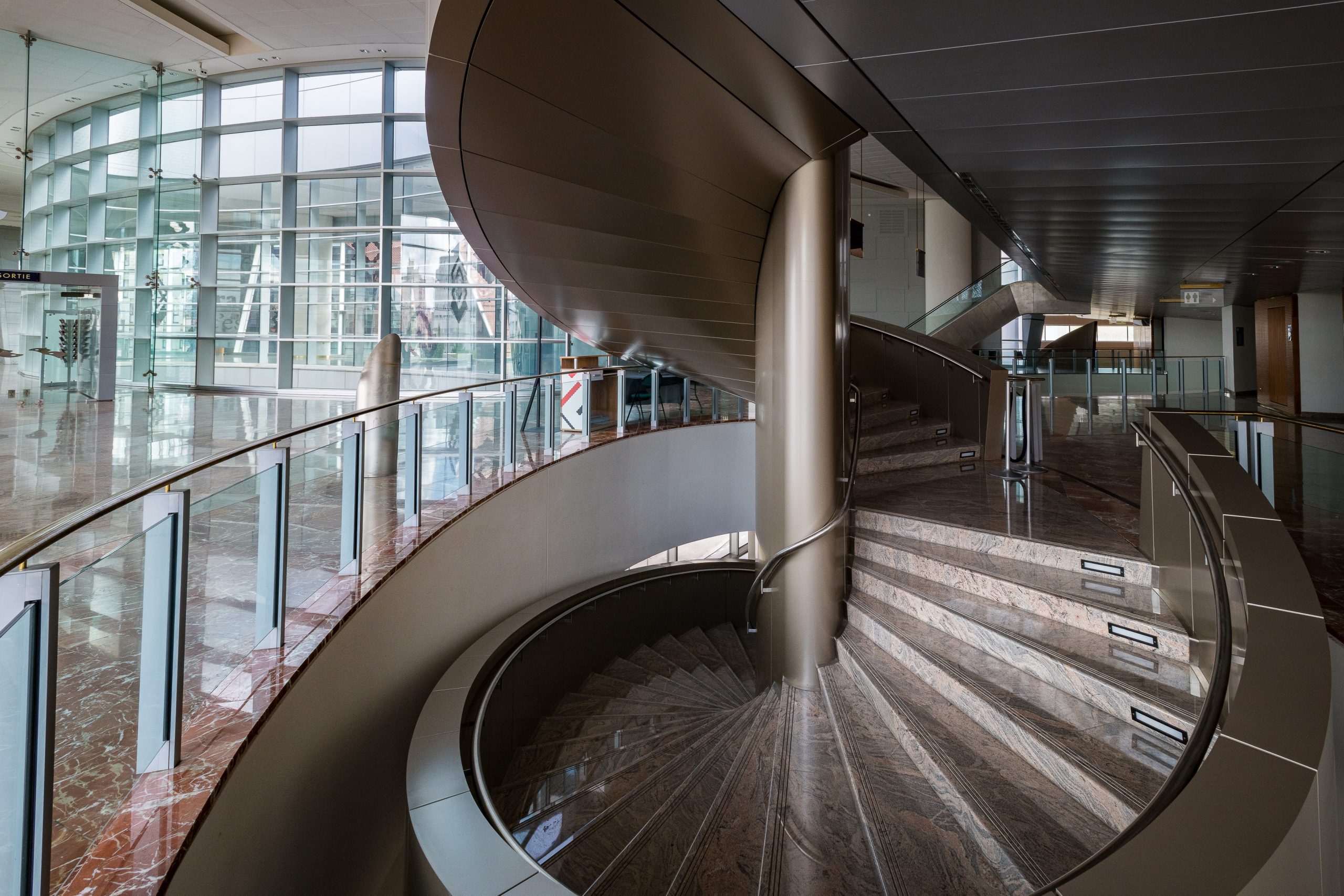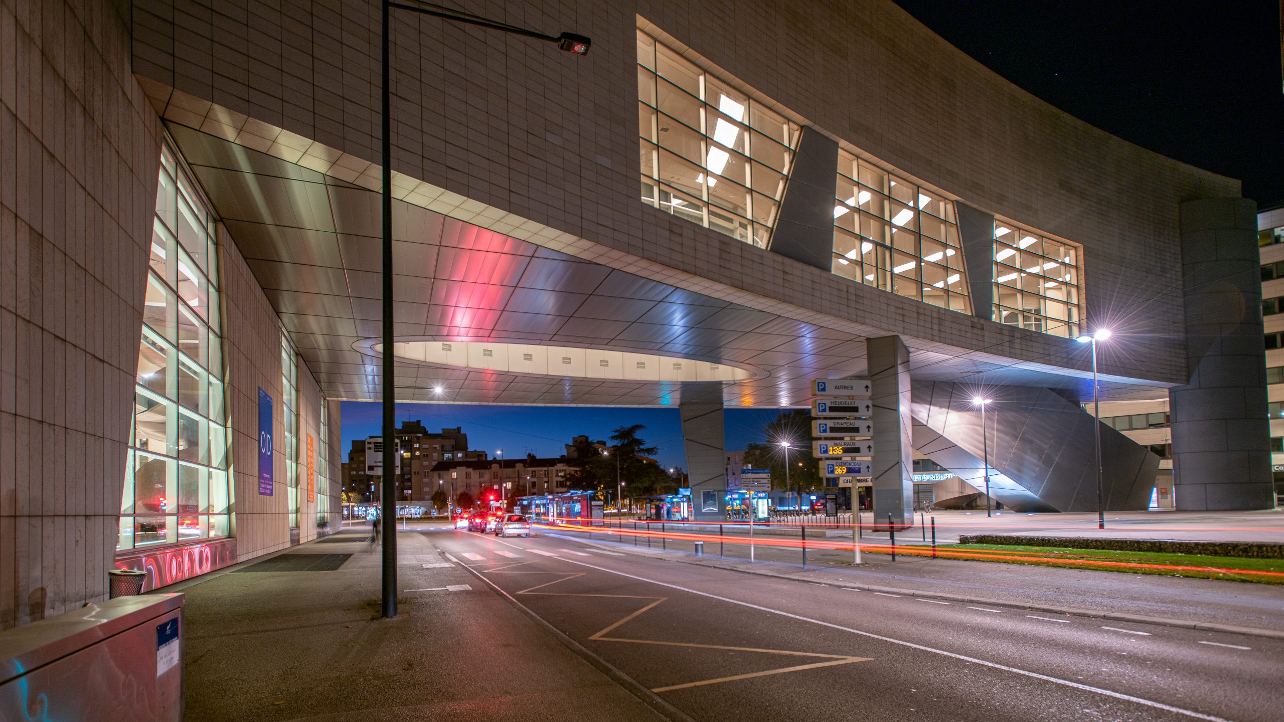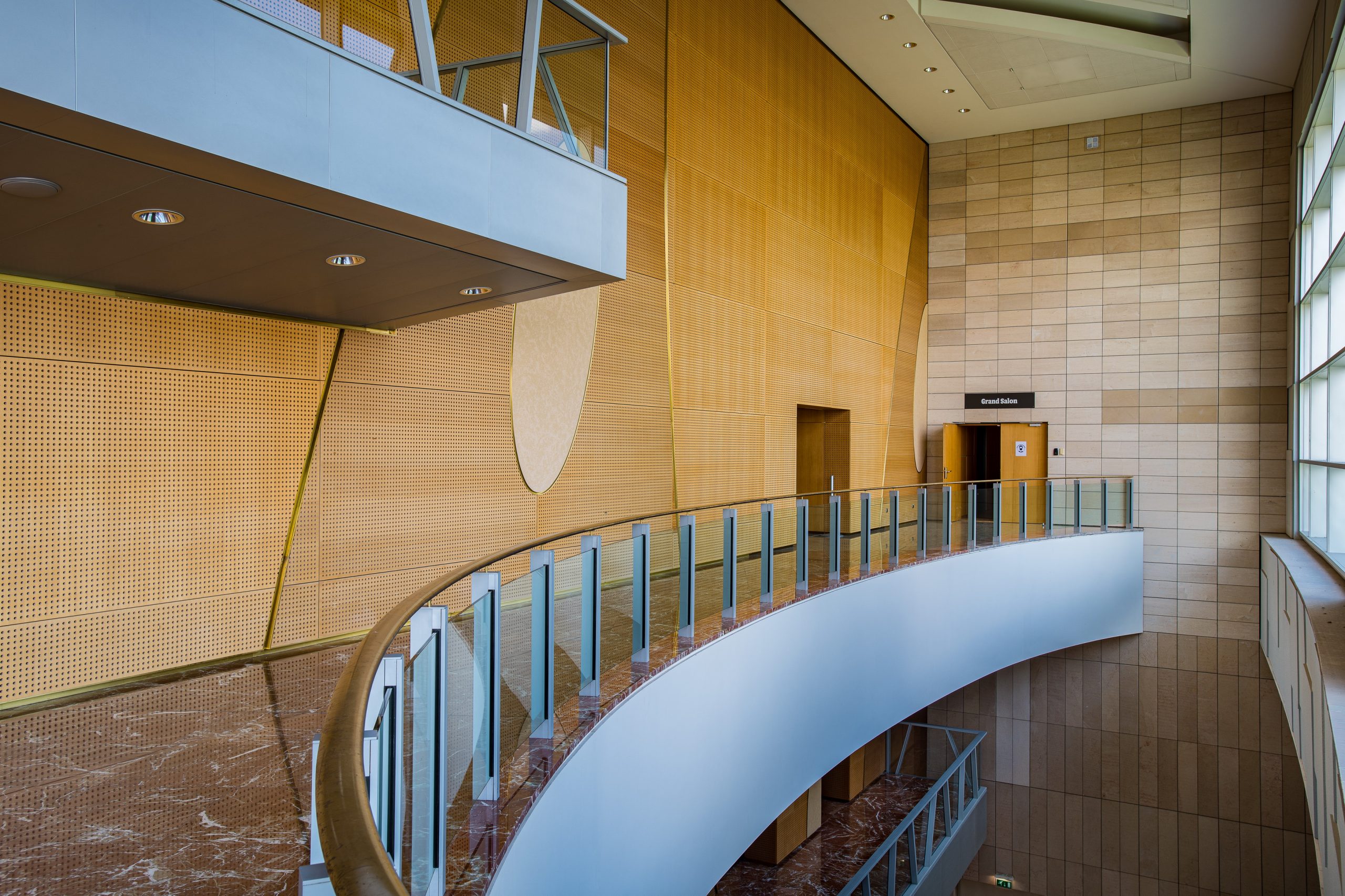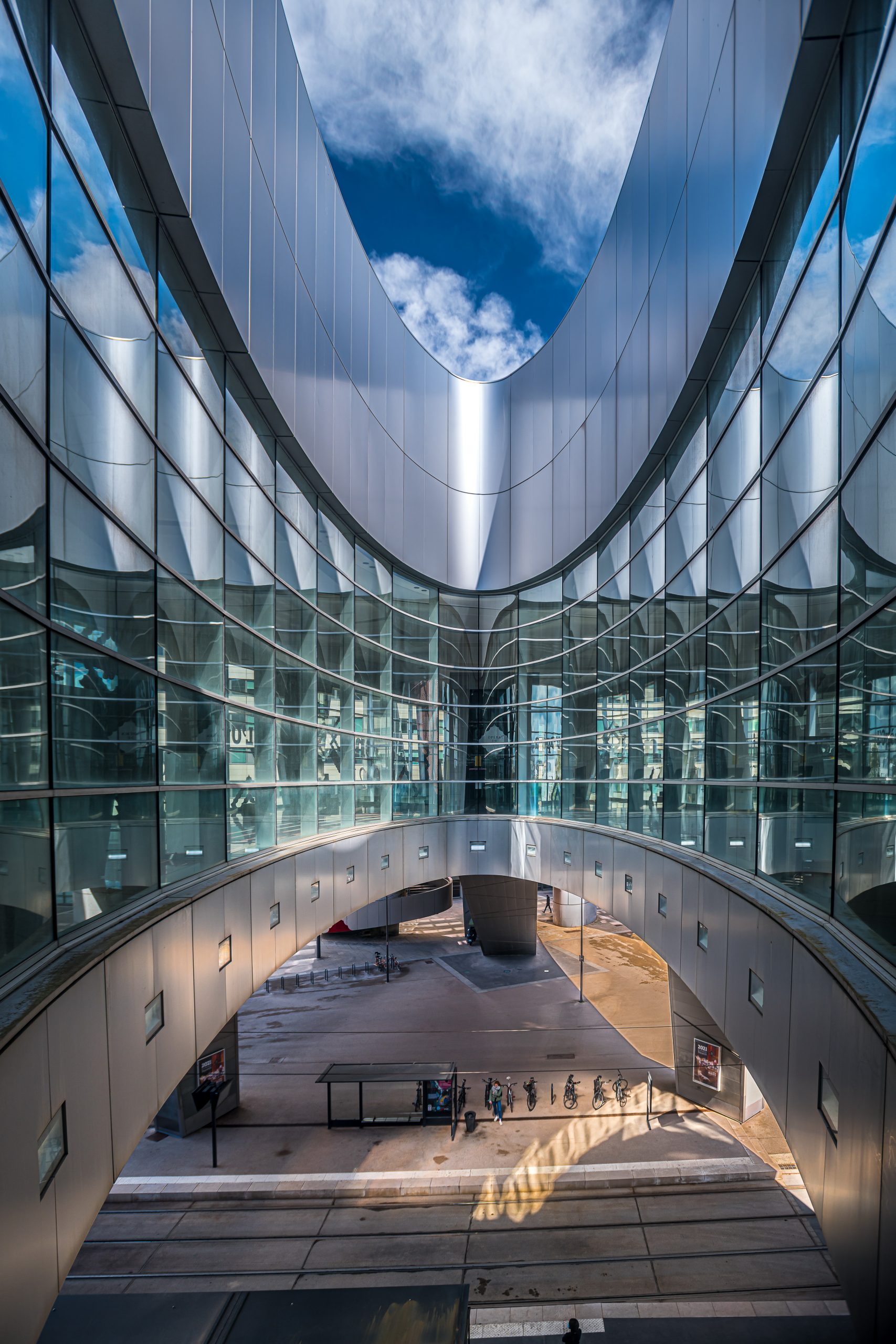 Les spectateurs entrent dans le bâtiment par de grands escalators et arrivent dans un immense espace vitré, avec une large vue sur le boulevard Clémenceau, à plus de 12 mètres de haut.