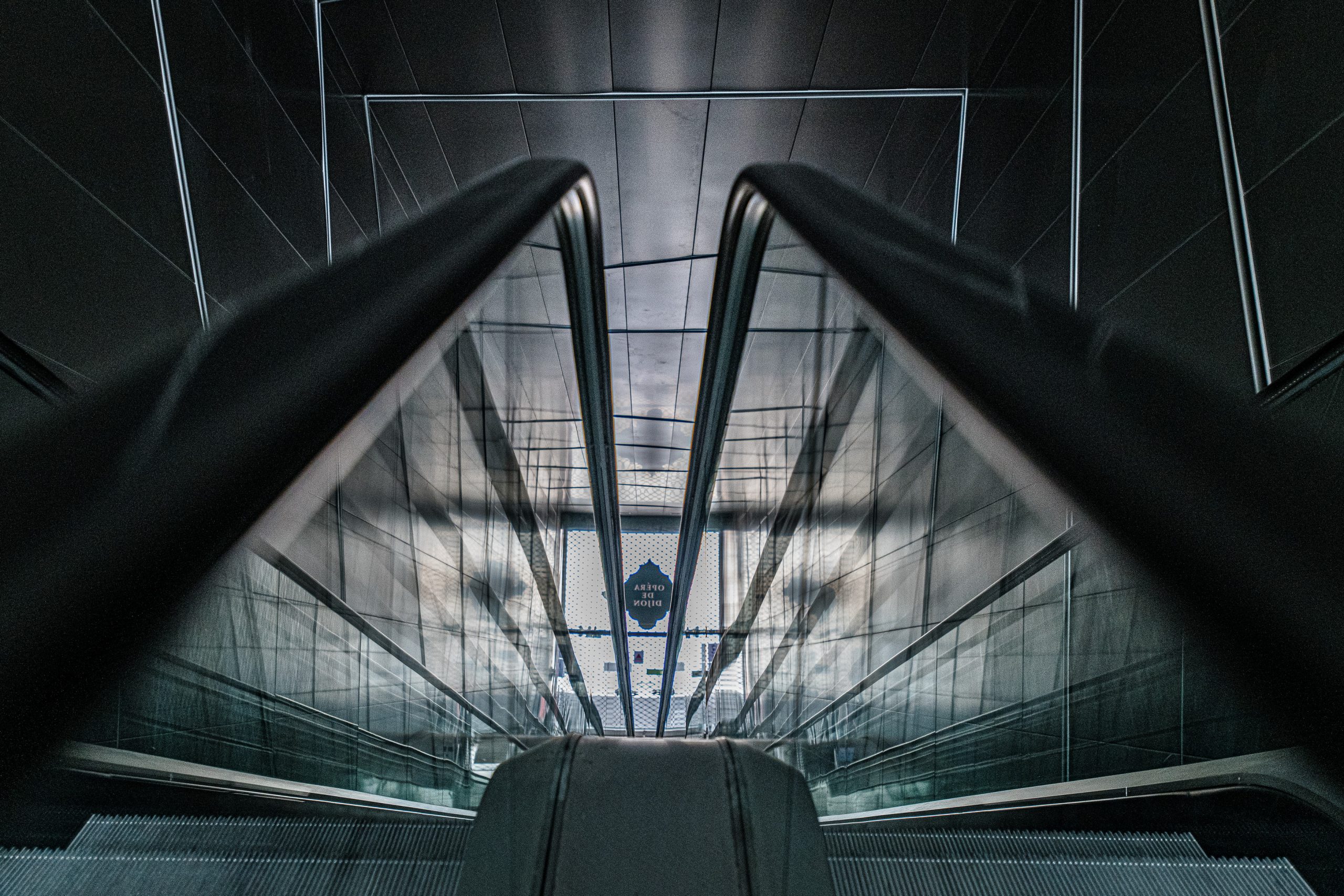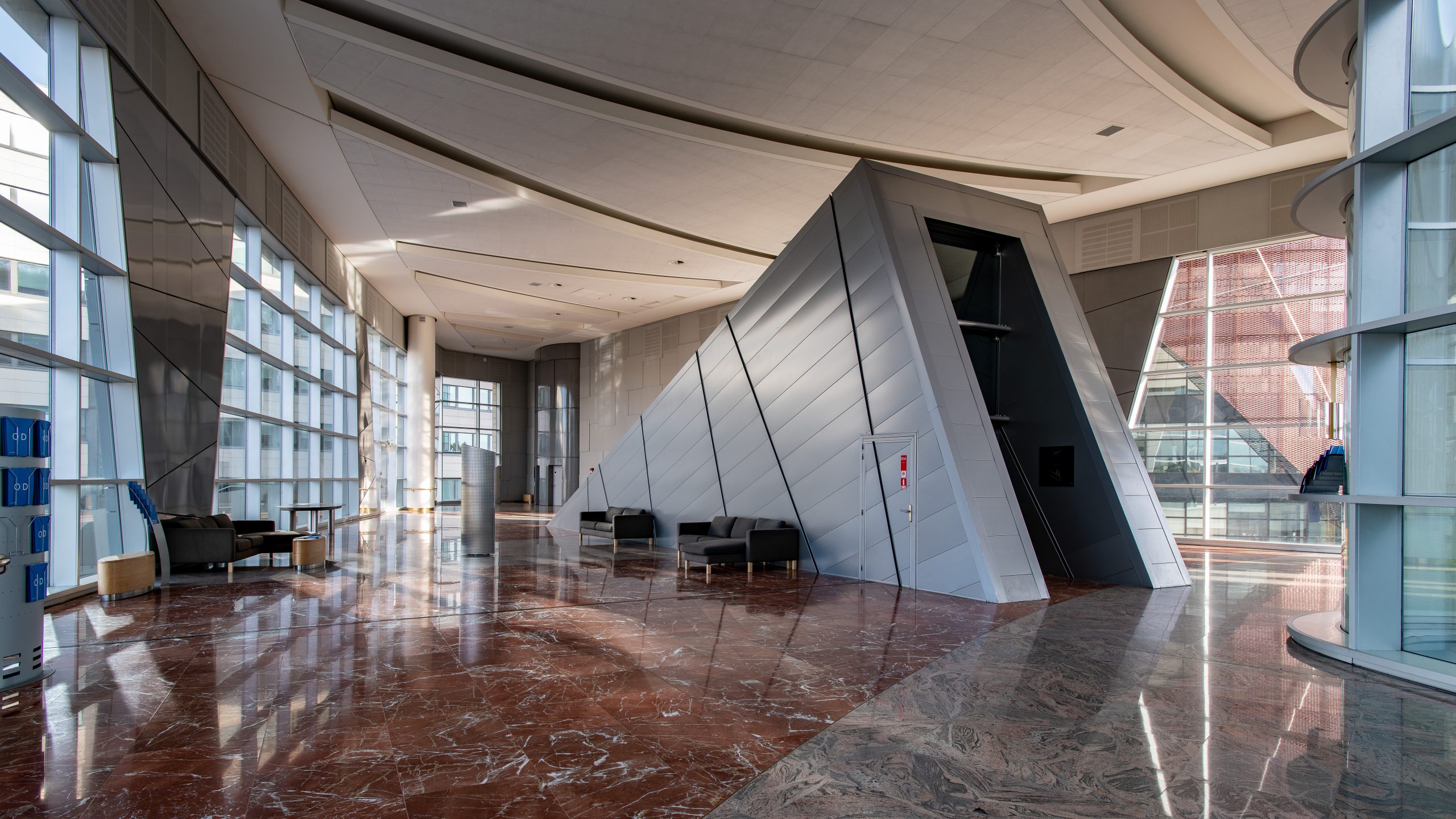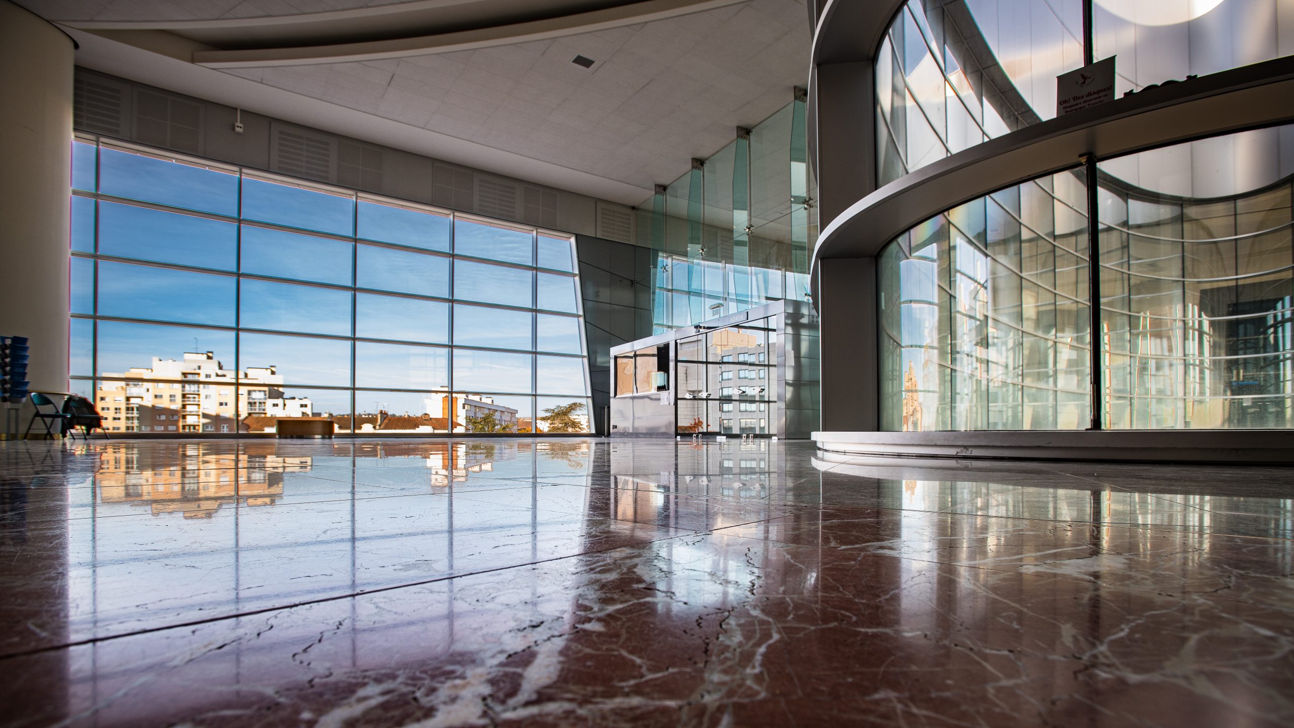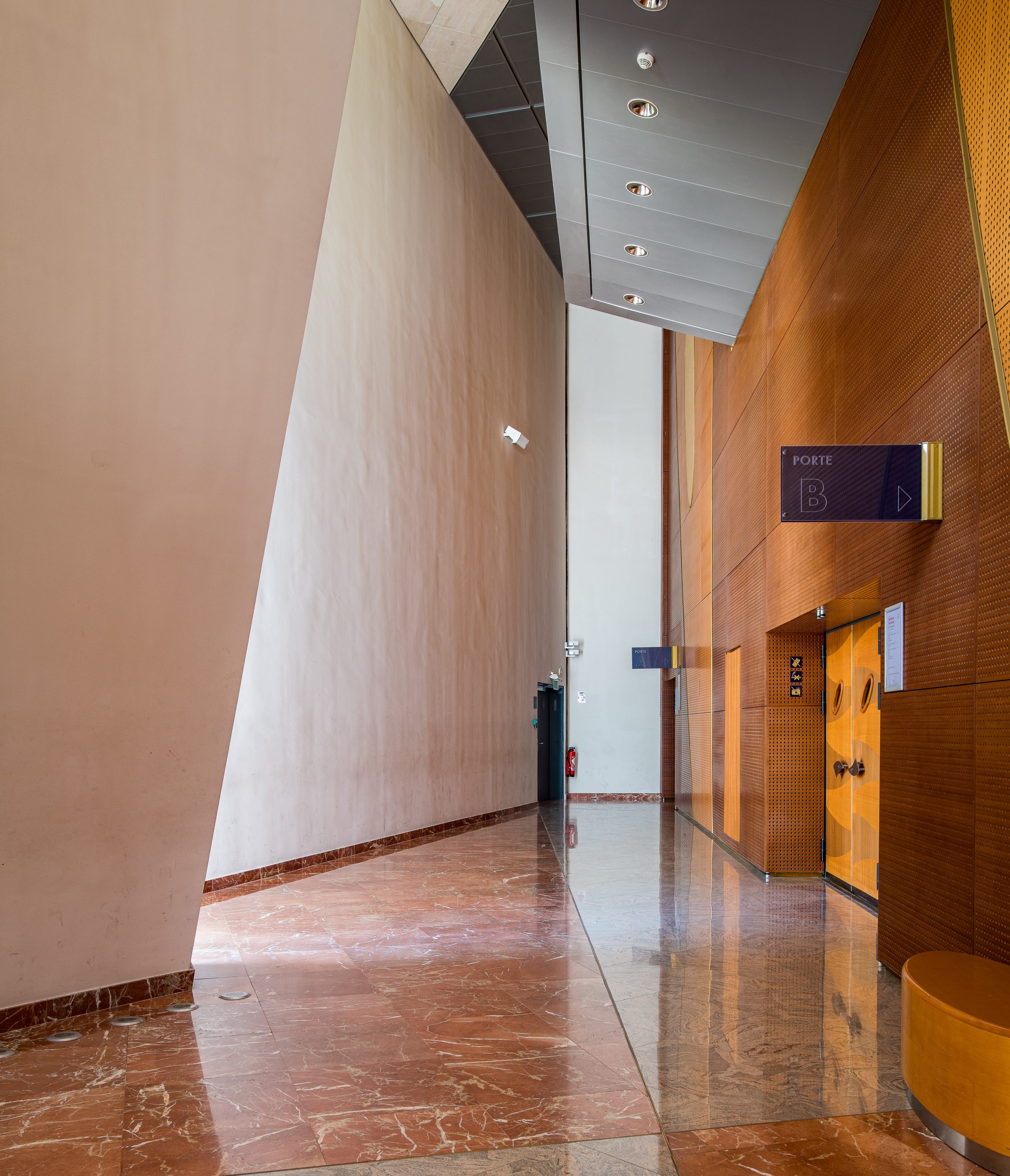 Les spectateurs entrent dans le bâtiment par de grands escalators et arrivent dans un immense espace vitré, avec une large vue sur le boulevard Clémenceau, à plus de 12 mètres de haut.