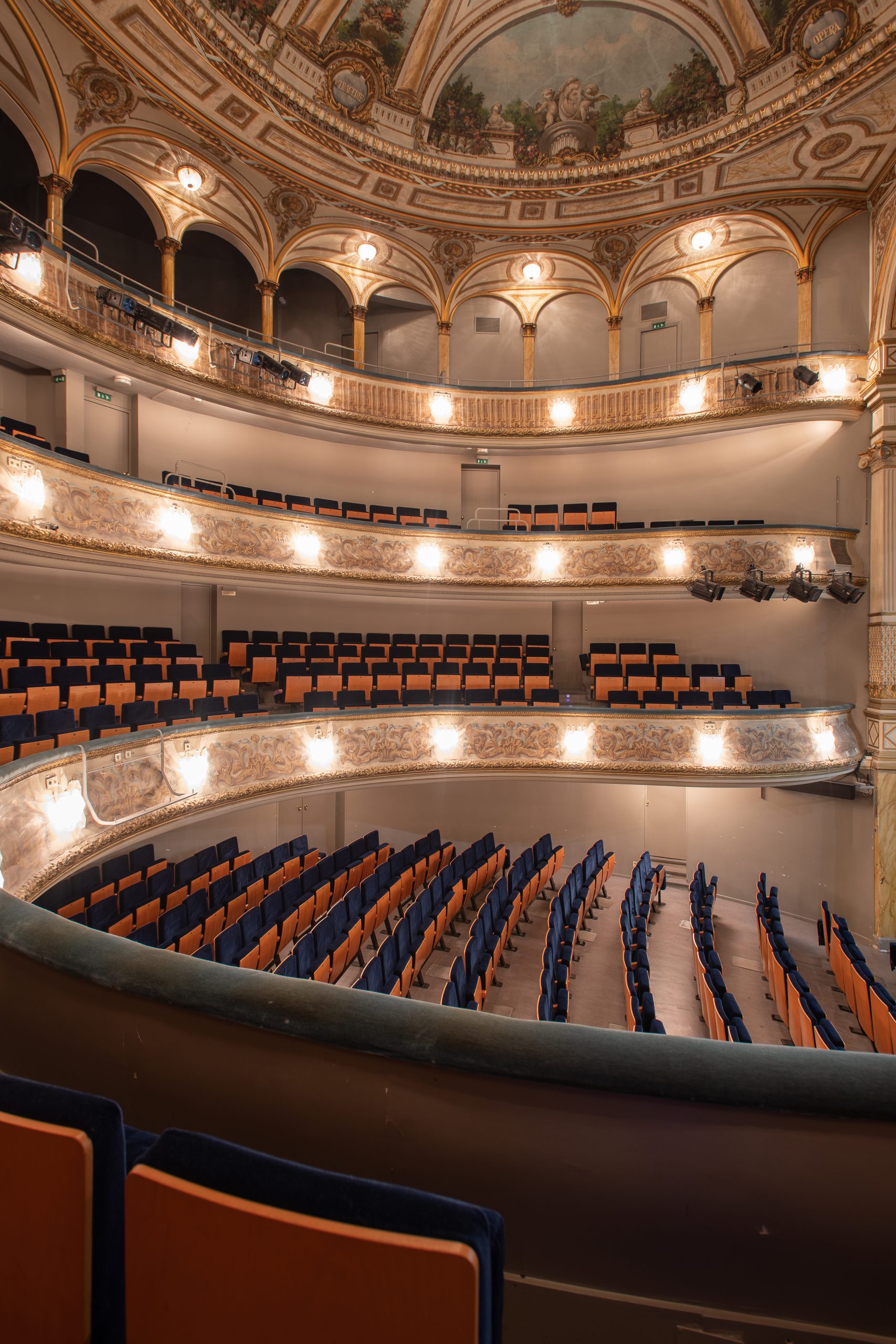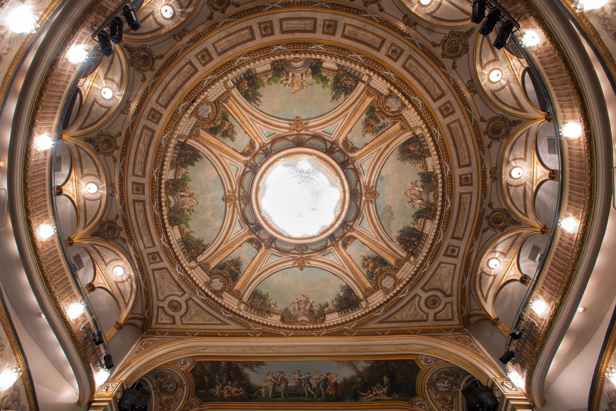 En levant les yeux, on peut admirer différentes fresques peintes par Charles Cambon en 1855 (élève de Ciceri - décorateur de l’Opéra de Paris qui a également réalisé la Fenice de Venise) dont des allégories de la danse et de la musique, et une frise représentant Apollon et ses muses. C'est depuis le dernier balcon de ce théâtre que ces peintures sont les mieux visibles, et cela dans tous les théâtres à l'italienne existants et comportant ce type d'ornements. C'est pourquoi le dernier balcon des théâtres a été rebaptisé "Paradis" par son public alors qu'il avait historiquement la dénomination de "Poulailler", en référence à la "poulaille" de l'époque, comme se plaisait à l'appeler les personnes argentées, qui le composait.
