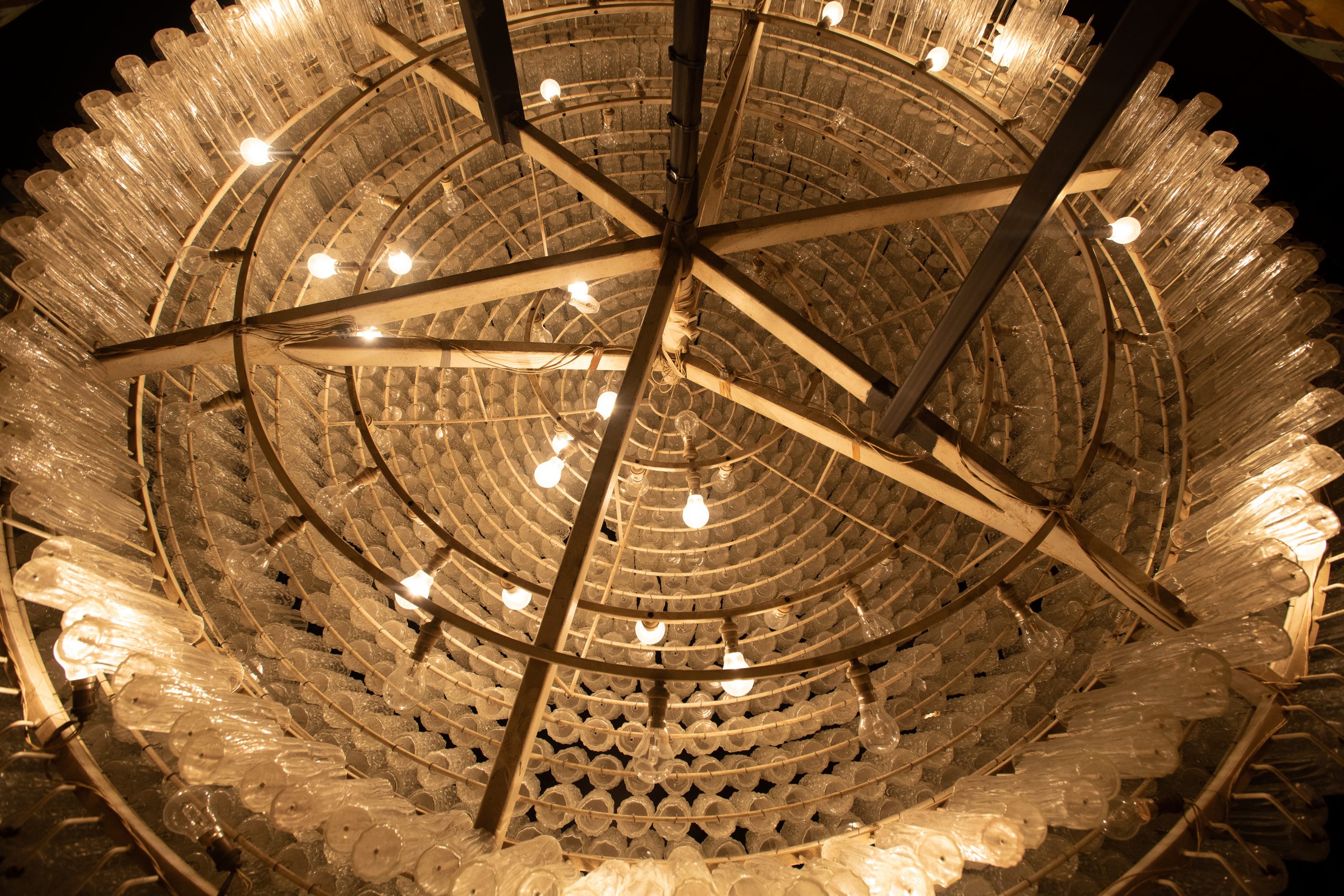 Afin d'éclairer cette salle du XIXe siècle, un lustre de 2,70m de large trône au milieu du plafond comprenant 2 000 tubes en verre de Murano (Venise).