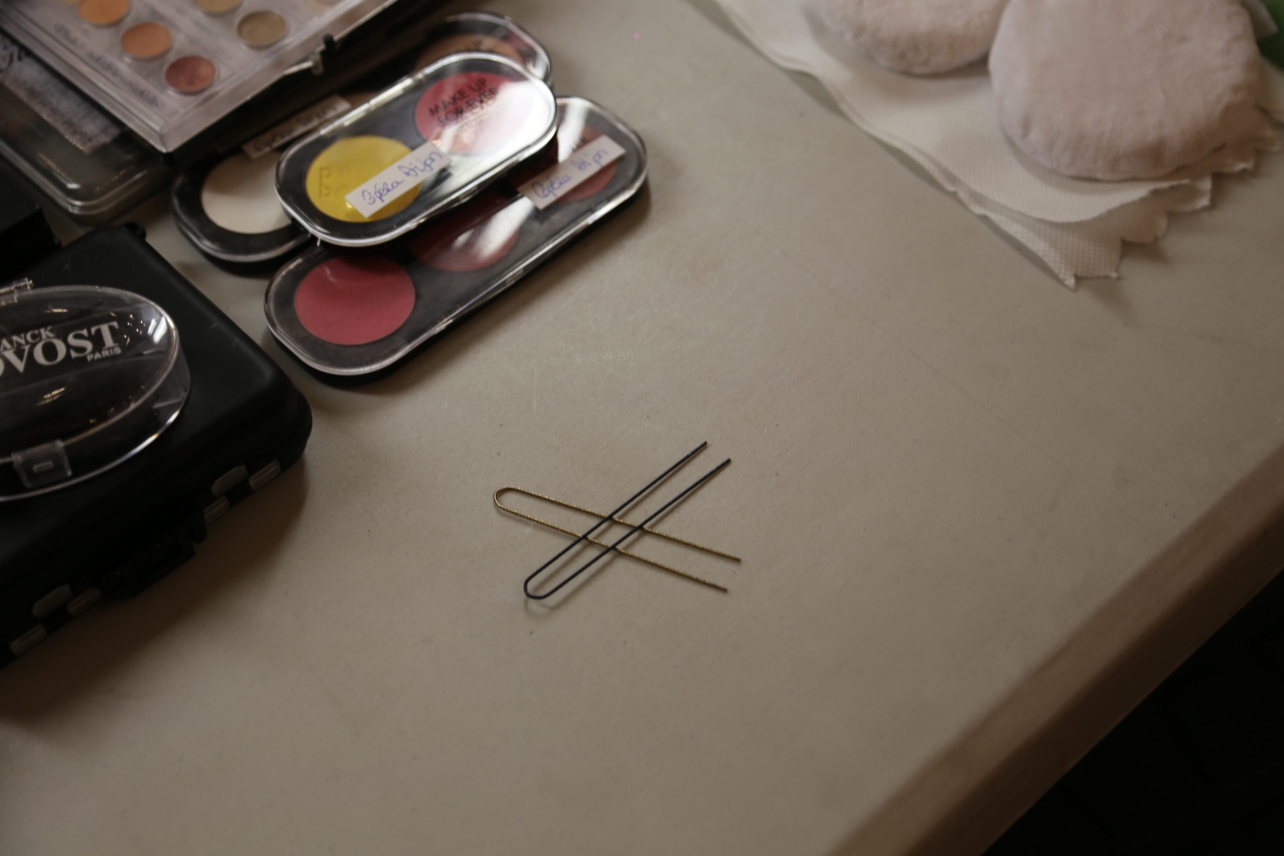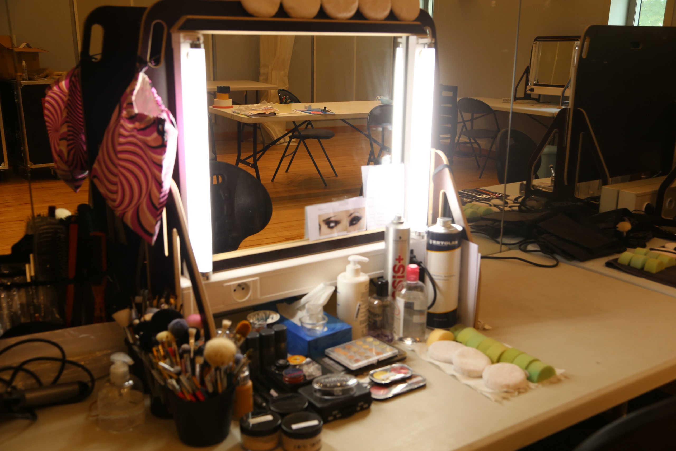 Au moment des dernières répétitions de l’opéra et pendant toutes les représentations, les maquilleurs et les coiffeurs s’installent à quelques pas de la scène, dans le studio de danse de l’Opéra, qu’ils transforment en grande loge maquillage et coiffure.