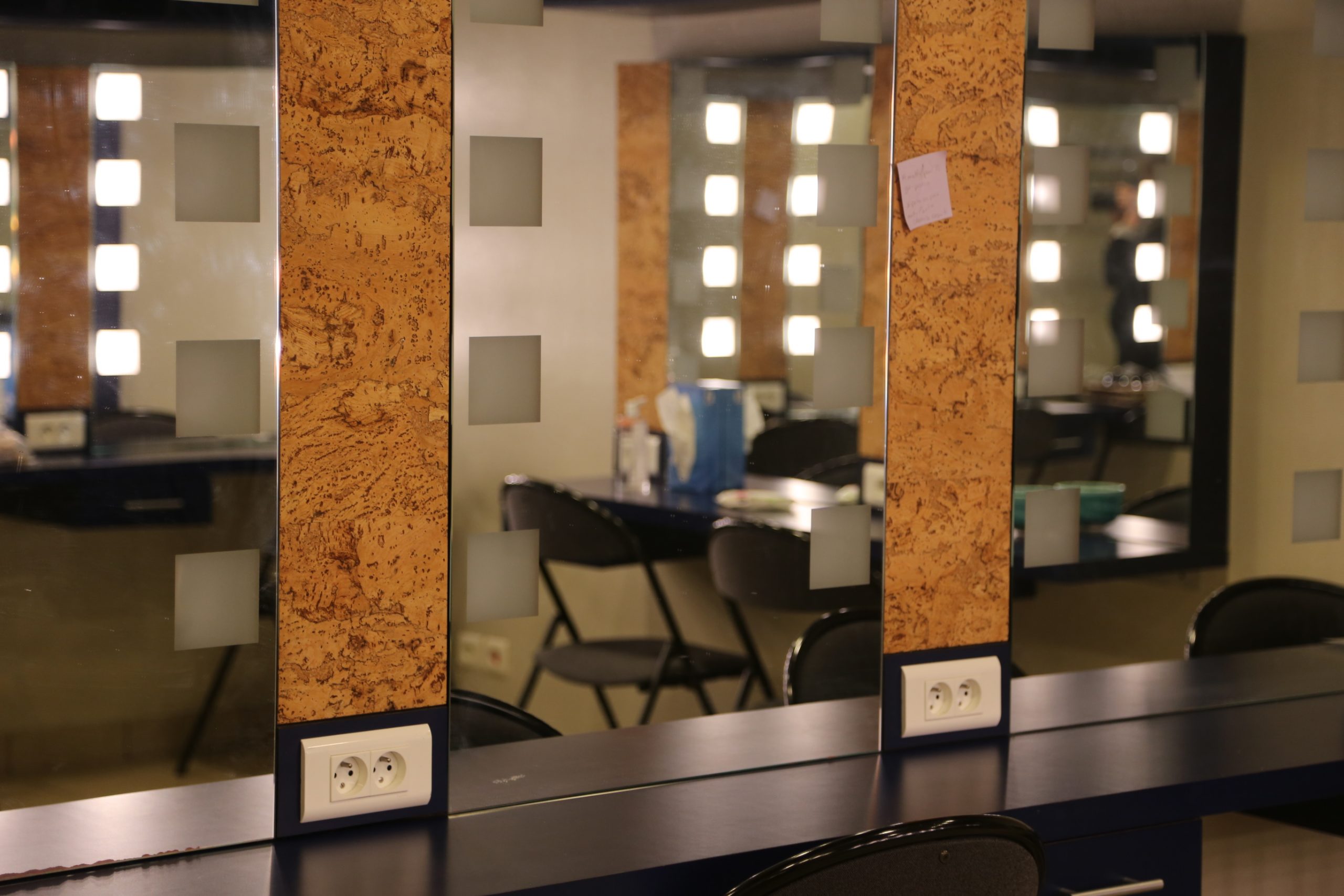 Dans une loge, on trouve un espace pour se détendre (canapé, fauteuil), un espace pour se préparer, avec un grand miroir et un éclairage important, une salle de bain, et un portant pour déposer le costume de l’artiste. Il y a également un haut-parleur qui diffuse les messages adressés aux artistes par la régie plateau et un écran qui retransmet ce qu’il se passe sur scène. Selon les besoins de l’artiste, il peut aussi y avoir d’autres éléments : un piano, un pupitre…